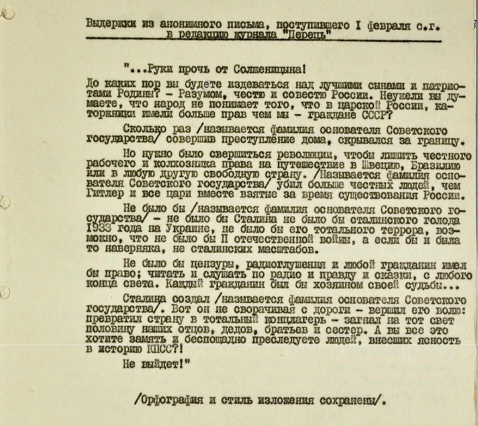 Довольно часто в редакцию украинского юмористического журнала “Перець” приходили письма антисоветского содержания. “Руки прочь от Солженицына! До каких пор вы будете издеваться над лучшими сынами и патриотами Родины?” – вопрошал автор одного из них, отправленного в феврале 1974 года.