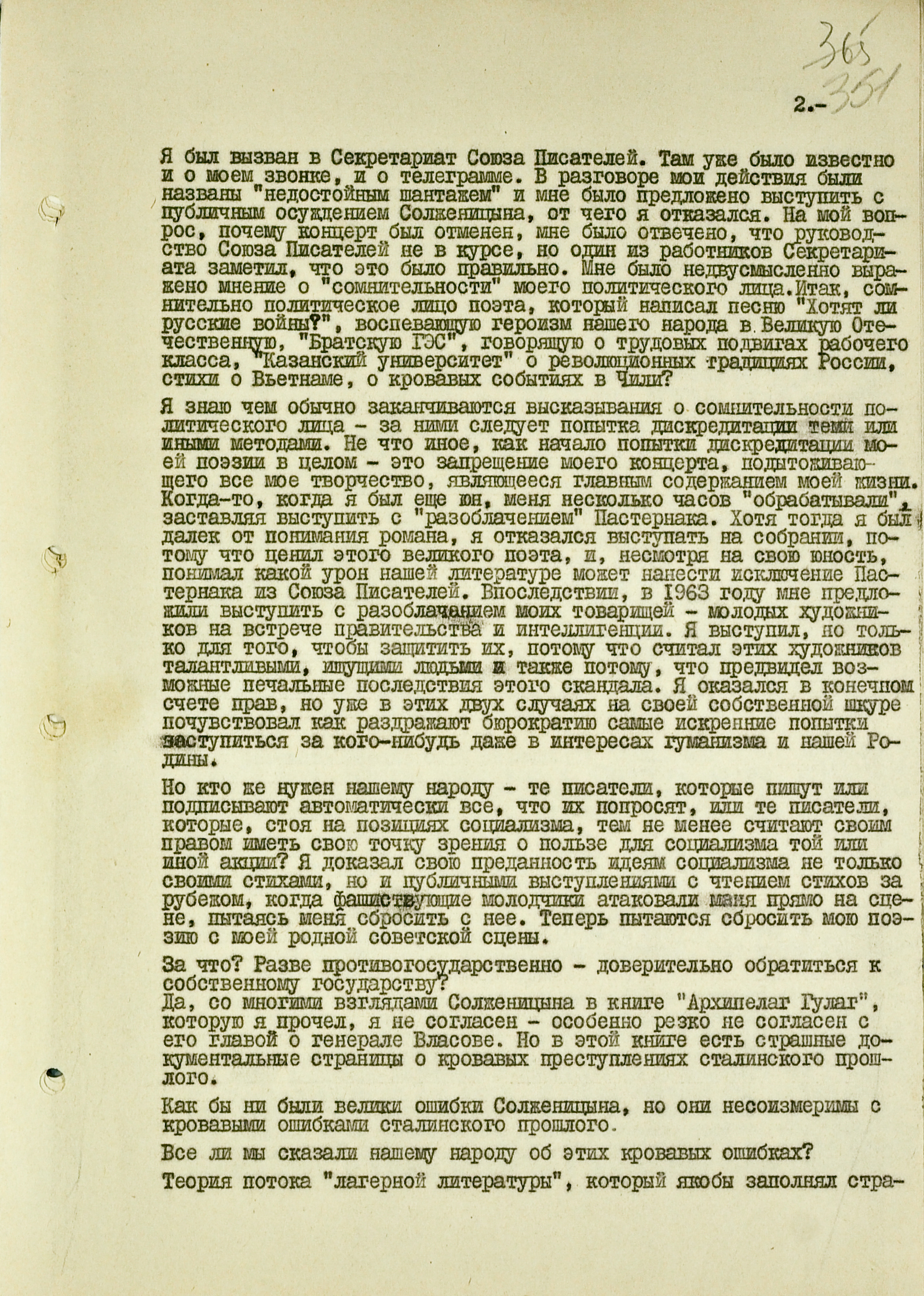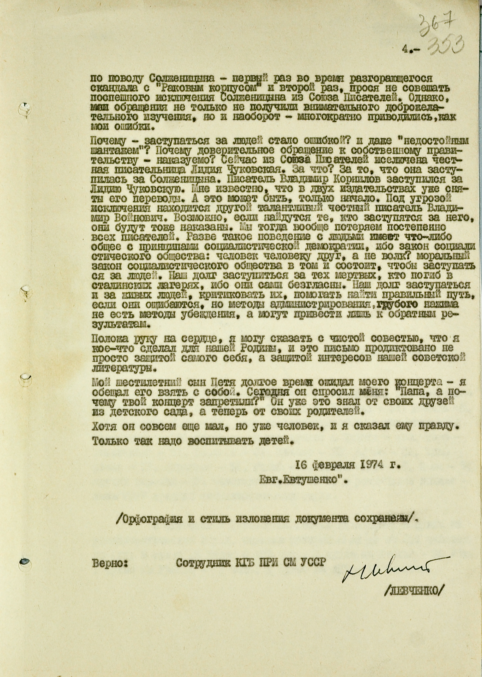 Вскоре после высылки Солженицына КГБ перехватил письмо из Москвы, адресованное в Киев поэту Ивану Драчу (который ранее попадал в поле зрения органов из-за антисоветских высказываний и связей с диссидентами). Автором письма был Евгений Евтушенко. Он обращался к советским радиослушателям (Драч, судя по всему, был не единственным адресатом). Евтушенко объясняет недавнюю отмену своего концерта новостью об аресте Солженицына. Он вступается за опального писателя, а также за коллег, поступивших так же и успевших из-за этого впасть в немилость.
