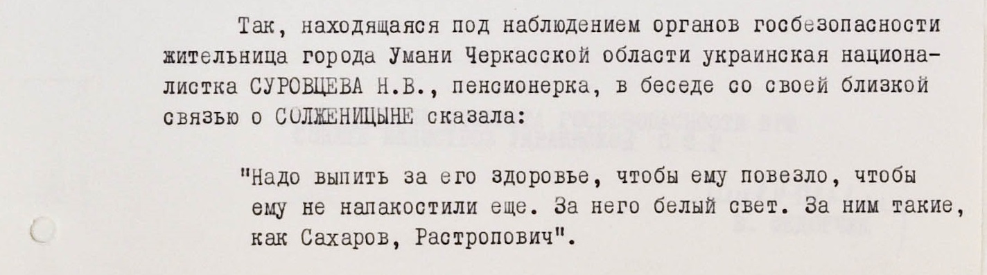 Как это обычно бывало, записки КГБ о “всенародном одобрении” завершались обзором “политически вредных суждений”, высказанных “отдельными националистически и антисоветскими лицами”. “Надо выпить за его (Солженицына – ред.) здоровье, чтобы ему повезло, чтобы ему не напакостили еще. За него белый свет. За ним такие, как Сахаров, Ростропович”, – призывала кого-то из близких пенсионерка из Умани Надежда Суровцева (чаще встречается другой вариант написания фамилии - Суровцова).