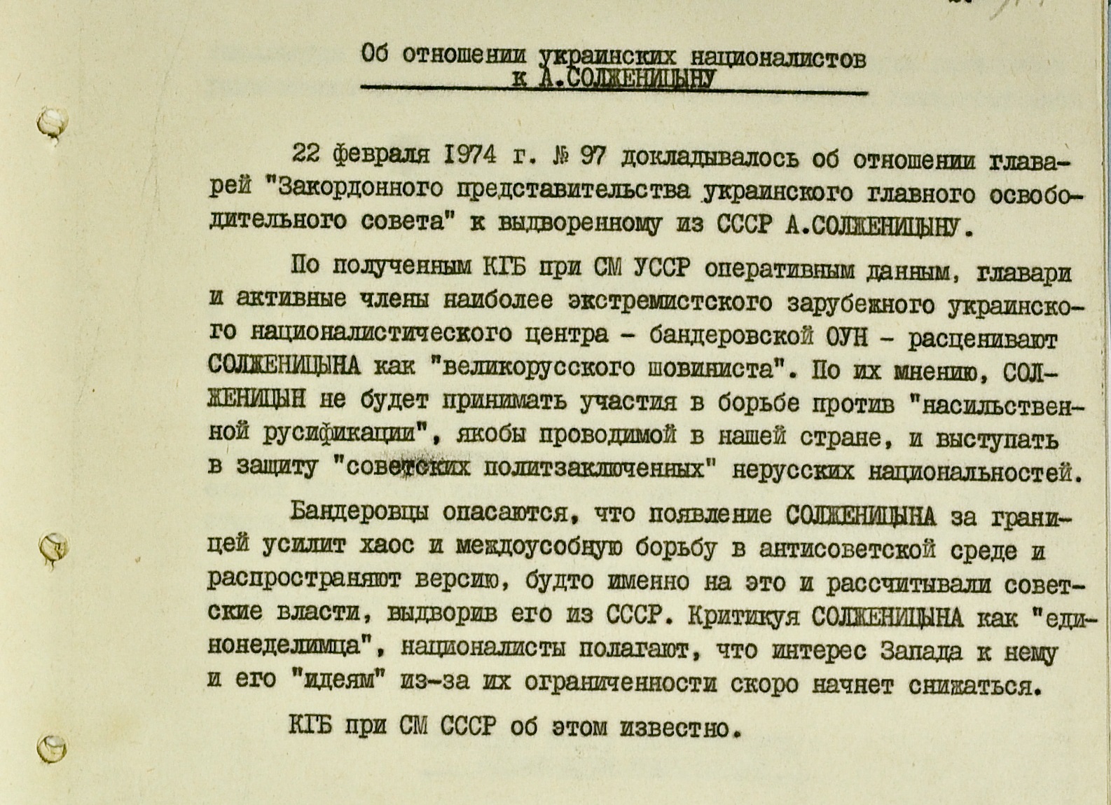 При переезде на Запад видных диссидентов КГБ, как правило, прикладывал усилия для того, чтобы помешать их сотрудничеству с эмигрантскими антисоветскими организациями. Вскоре после высылки Солженицына республиканский Комитет несколько раз докладывает в ЦК об отношении к нему украинских националистов из диаспоры. Из записок следует, что здесь советскому режиму беспокоиться не о чем – русский писатель и украинские структуры вряд ли смогут противостоять ему сообща. К тому времени в некоторых кругах Солженицына считали русским шовинистом, “единонеделимцем”. В том же “Архипелаге ГУЛАГ”, с одной стороны, присутствуют сочувственные пассажи о заключенных-“бендеровцах” и идее независимости Украины, с другой – примечание о “тяготеющих к России” левобережных областях, которым будет нужен плебисцит. Да и украинскую самостоятельность писатель допускал не навсегда, а с прицелом на “восстановление единства в будущем”. Наиболее радикальную позицию по отношению к Солженицыну заняла “бандеровская” ветвь Организации украинских националистов. “По их (представителей “бандеровской” ОУН – ред.) мнению, Солженицын не будет принимать участия в борьбе против “насильственной русификации”, якобы проводимой в нашей стране, и выступать в защиту “советских политзаключенных” нерусских национальностей”. Бандеровцы опасаются, что появление Солженицына усилит хаос и междоусобную борьбу в антисоветской среде и распространяют версию, будто именно на это и рассчитывали советские власти, выдворив его из СССР”, – отмечали в спецслужбе.