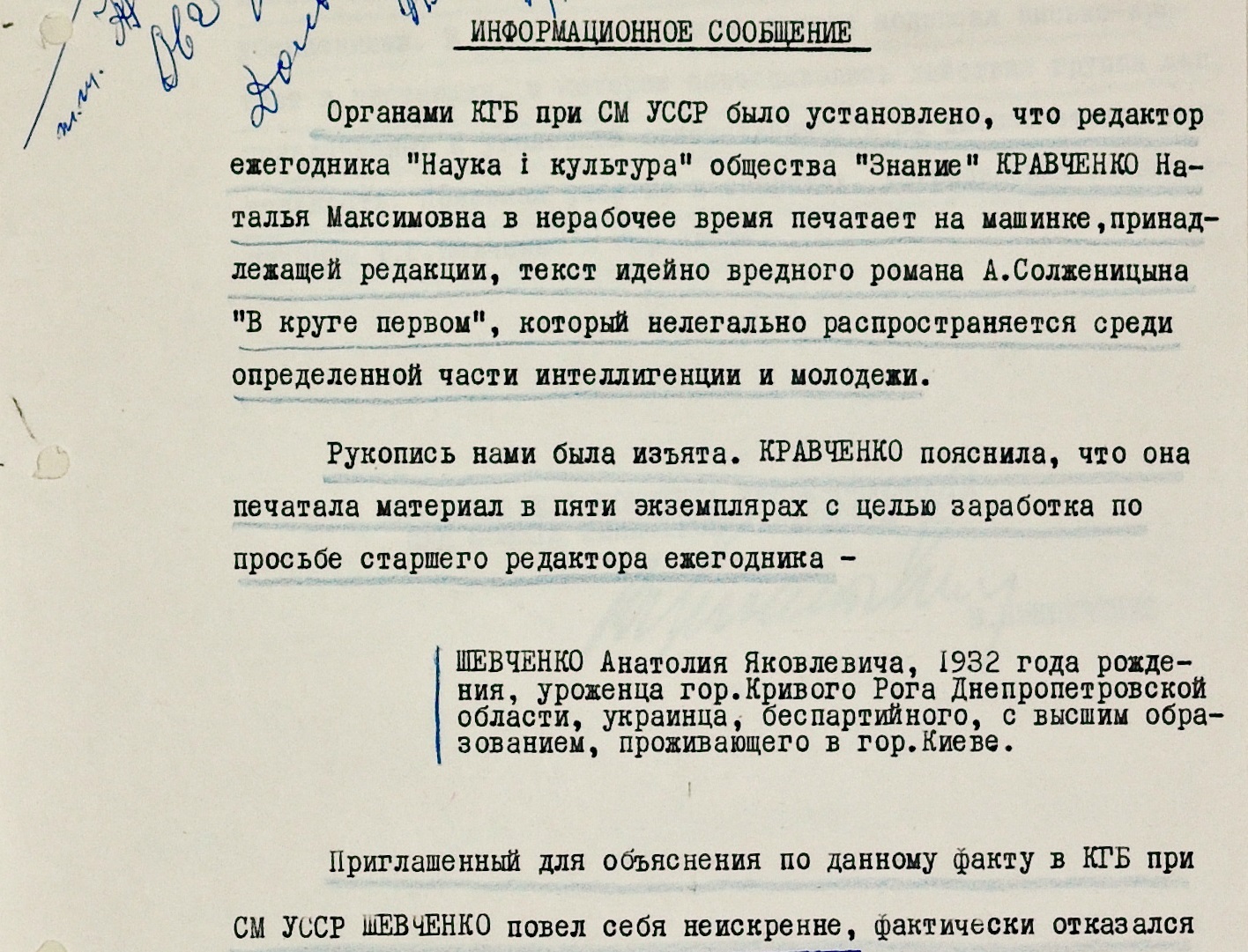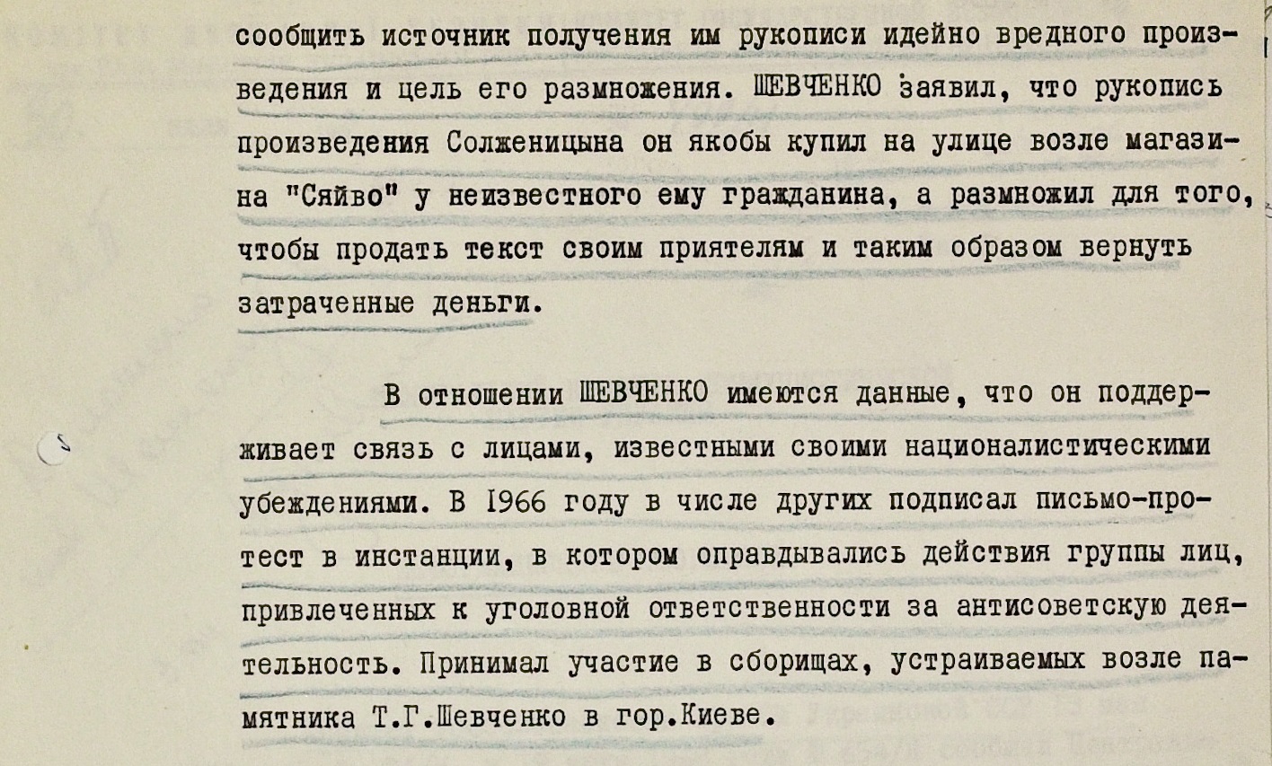 С 1960-х до конца 1980-х произведения Александра Солженицына находились в СССР под запретом. Однако по стране ходили “самиздатовские” копии книг писателя. Одни, рискуя, покупали (или брали почитать у знакомых) демонизированные госпропагандой издания, другие, имевшие такую возможность, сами изготовляли копии. В 1969 году на выпуске самиздата попалась редактор ежегодника “Наука і культура” киевлянка Наталья Кравченко. В нерабочее время она набирала на редакционной печатной машинке текст “идейно вредного романа А. Солженицына “В круге первом”, который нелегально распространялся среди определенной части интеллигенции и молодежи”. Рукопись изъяли, женщину допросили. Она заявила, что готовила пять копий книги. Цель – заработать на их продаже. А организовал все, по словам Кравченко, старший редактор Анатолий Шевченко. По словам последнего, роман он купил у незнакомца на улице возле магазина “Сяйво” (известный книжный магазин в центре Киева). Копии делались якобы для того, чтобы продать знакомым и вернуть потраченные средства. Пояснения Шевченко показались чекистам неискренними. Тем более раньше его уличали в связях с националистами и участии в антисоветских акциях. Уголовного преследования старший редактор избежал – видимо, обошлись лишь профилактикой. Впоследствии Анатолий Шевченко стал известным журналистом и литературным критиком.