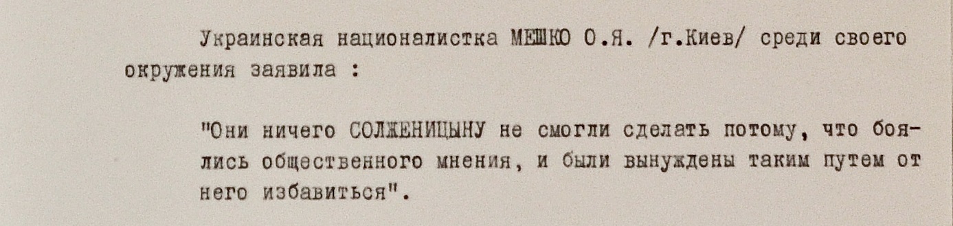Дошли до спецслужб и слова известной участницы украинского диссидентского движения Оксаны Мешко: “Они ничего Солженицыну не смогли сделать, потому что боятся общественного мнения и вынуждены таким путем от него избавиться”.