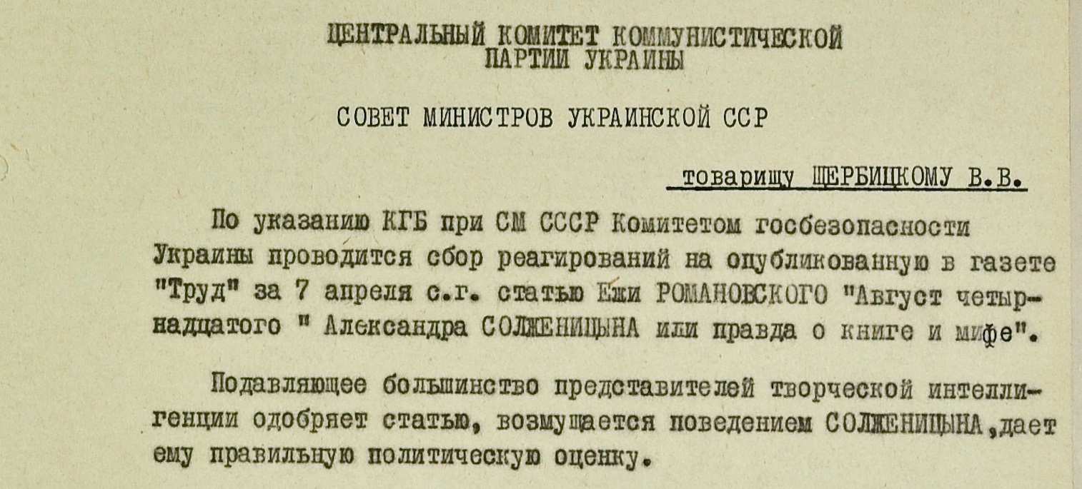 С помощью агентурной сети КГБ собирал и записывал отзывы людей о происходящих в стране резонансных событиях. В том числе о преследовании диссидентов – арестах, судебных приговорах, “разоблачительных” статьях в прессе. В апреле 1972 года газета “Труд” опубликовала переведенную с польского разгромную рецензию Ежи Романовского на недавно вышедший роман Солженицына “Август Четырнадцатого”. Через несколько дней “комитетчики” рапортовали: “Подавляющее большинство представителей творческой интеллигенции одобряет статью, возмущается поведением Солженицына, дает ему правильную политическую оценку”.