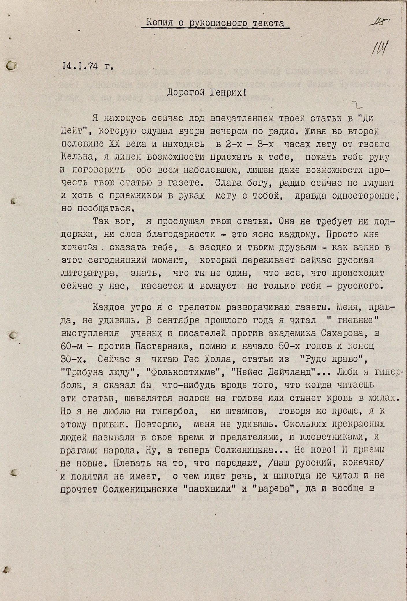 “Ну, а теперь Солженицына... Не ново! И приемы не новые. Плевать на то, что передовик (наш русский, конечно) и понятия не имеет, о чем идет речь, и ничего не читал и не хочет солженицынских “пасквилей” и “варева”, да и вообще в большинстве своем даже не знает, кто такой Солженицын. Враг – и все!” –сокрушается Некрасов по поводу травли писателя-диссидента. Упомянул автор и ту самую статью “Путь предательства”: “Бессмысленно оспаривать гнусные обвинения никому не известного П. Соловьева в “Правде” по адресу Солженицына. Они настолько лживы, злобны и беспомощны, что не требуют даже аргументации. Горько другое – “Правда” все-таки есть “Правда”, и читают ее миллионы, и многие верят”. Через некоторое время Бёлль будет встречать во Франкфурте самолет с выдворенным Солженицыным. Первые несколько дней на Западе советский писатель проведет в доме своего немецкого друга под Кельном.