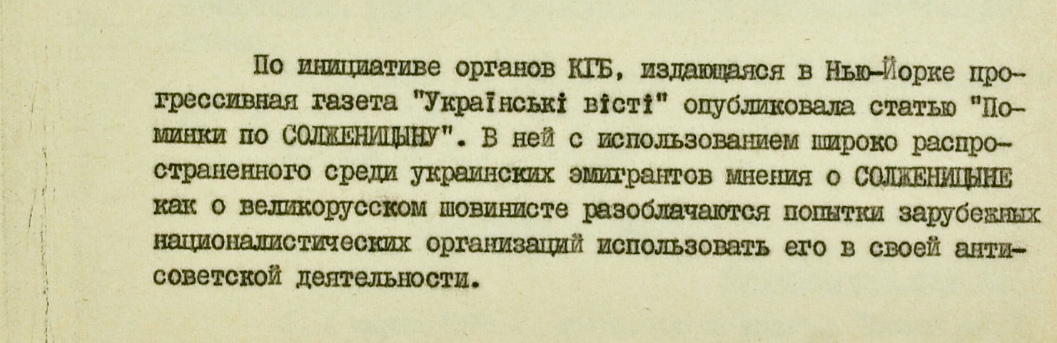 Кроме того, КГБ инициировал выход в нью-йоркском “прогрессивном” издании “Українські вісті” материала “с использованием широко распространенного среди украинских эмигрантов мнения о Солженицыне как о великорусском шовинисте”.