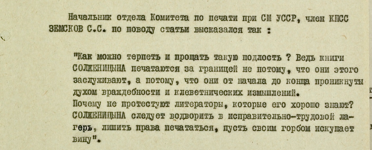 “КГБ при СМ УССР принимает меры для использования отрицательного отношения украинской эмиграции к Солженицыну в интересах нашего государства”, – сообщалось в одной из записок. К кампании против писателя чекисты подключили “прогрессивные” (лояльные к СССР) структуры американских украинцев. В ряде газет диаспоры вышли статьи “о единодушном осуждении советской общественностью антинародной деятельности Солженицына”.