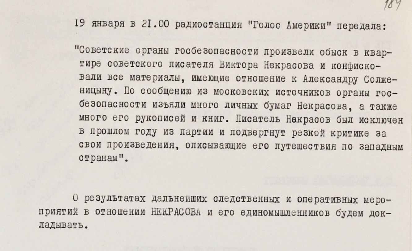Двумя годами позже, как раз в разгар кампании по выдворению Солженицына, к Некрасову пришли с обыском (санкцию дал лично глава ЦК КПУ Владимир Щербицкий). Изъяли множество разной “антисоветчины”, в том числе книги все того же Солженицына и кассеты с передачами “Немецкой волны” об “Архипелаге ГУЛАГ”.