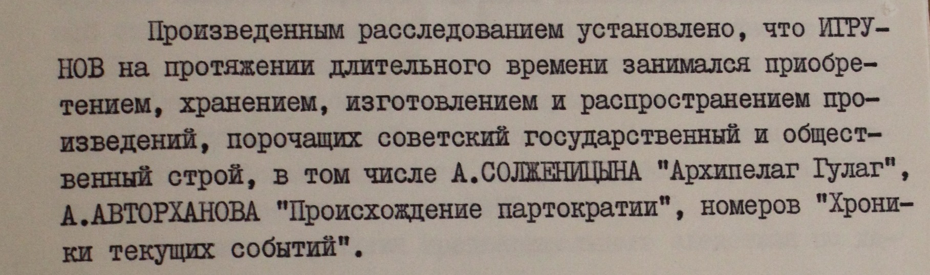 В приобщенных к делу протоколах осмотра есть рецензии на изъятые у Игрунова издания - в том числе “Архипелаг ГУЛАГ” и “Письмо вождям Советского Союза”. В обоих случаях делаются выводы о “злобном антисоветском характере” этих работ.