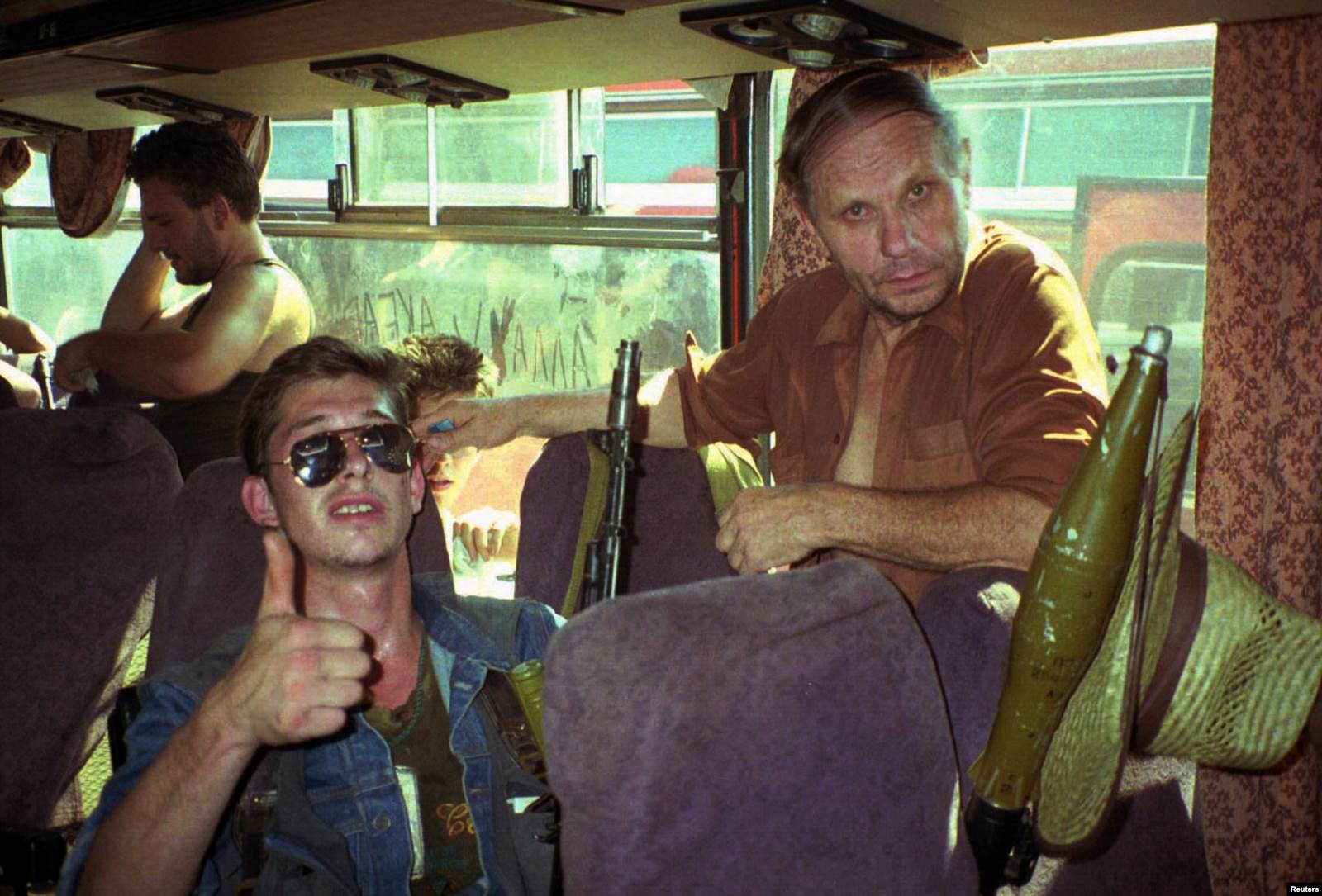 За нами потом ехали две машины с российскими милиционерами, уже за ними – автобусы с заложниками. Я помню, когда вертолеты зависли над автобусами, все ожидали, что начнется бомбежка. Тогда один из чеченцев, здоровый такой и босой, сказал: "Ментов расстреляем, заложников отпустим, а сами примем бой". А мы в ответ начали смеяться. Перед этим мы на одной из остановок разговаривали с этими милиционерами – более наивных людей я в жизни не видел. Я помню один милиционер с таким счастливым лицом говорил: "Ах какие они вежливые люди, эти чеченцы!" А чеченцы, действительно, с уважением к ним обращались, все отмечали вежливость чеченцев, хотя они и убивали. А тут мы через несколько минут слышим: "Ментов расстреляем". Наверное, от напряжения смеялись. Мы вообще смеялись всю дорогу. Я как-то сказал, что больницу захватили 200 тренированных самоубийц. Все рассмеялись. Смешно почему-то было.