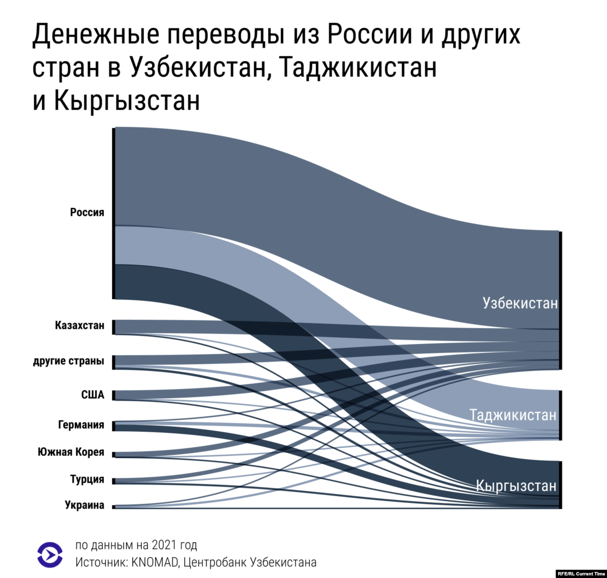Россия является главным источником денежных переводов для стран Центральной Азии. По данным местных нацбанков, доля российских трансфертов в 2021 году для Кыргызстана и Узбекистана составляла около 70%, а в 2022 году она выросла на 7 и 11 процентных пунктов соответственно. Для Таджикистана в 2021 году эта доля составляла почти 79%, следует из данных KNOMAD.