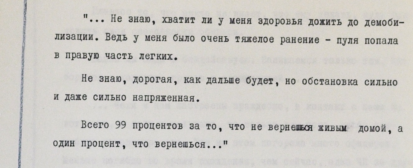 “Не знаю, хватит ли у меня здоровья дожить до демобилизации. Ведь у меня было очень тяжелое ранение – пуля попала в правую часть легких. Не знаю, дорогая, как дальше будет, но обстановка сильно и даже сильно напряженная. Всего 99 процентов за то, что не вернешься живым домой, а один процент, что вернешься”, – рассуждает в письме еще один солдат. Вернулся ли он домой живым, неизвестно.