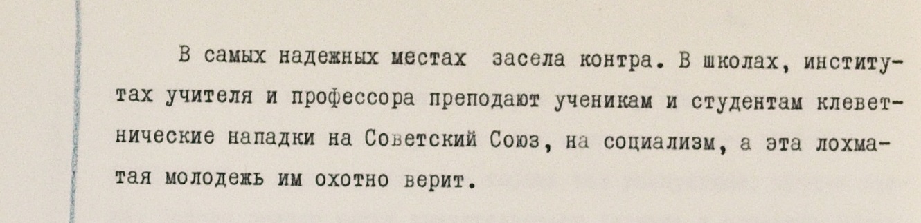 Антисоветские взгляды молодым людям навязывала чехословацкая интеллигенция, в том числе преподаватели, считали военные. В одном из писем есть такие строки: “В школах, институтах учителя и профессора преподают ученикам и студентам клеветнические нападки на Советский союз, на социализм, а эта лохматая молодежь им охотно верит”.