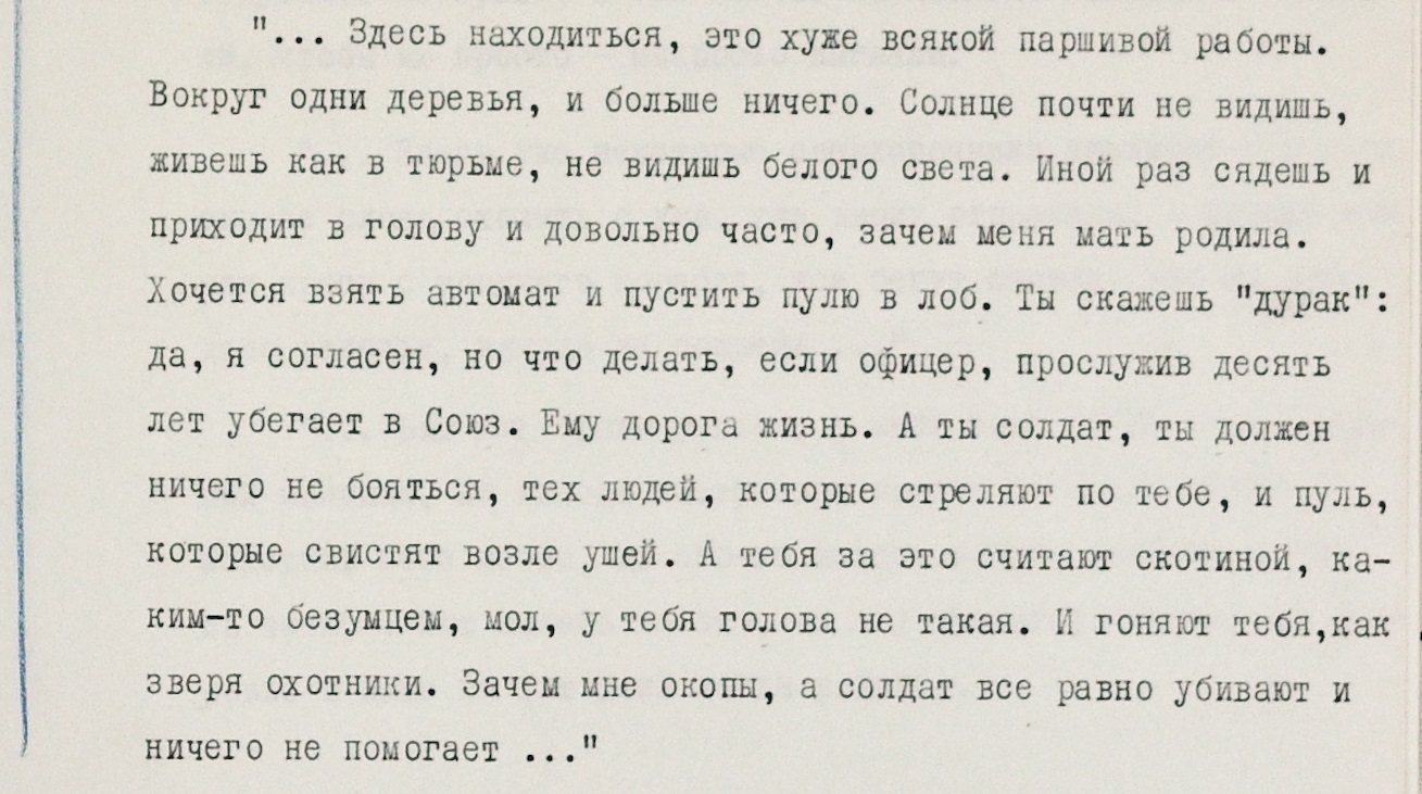 Неудивительно, что в такой обстановке военных посещали и суицидальные мысли: “Иной раз сядешь и приходит в голову и довольно часто, зачем меня мать родила. Хочется взять автомат и пустить пулю в лоб”.
