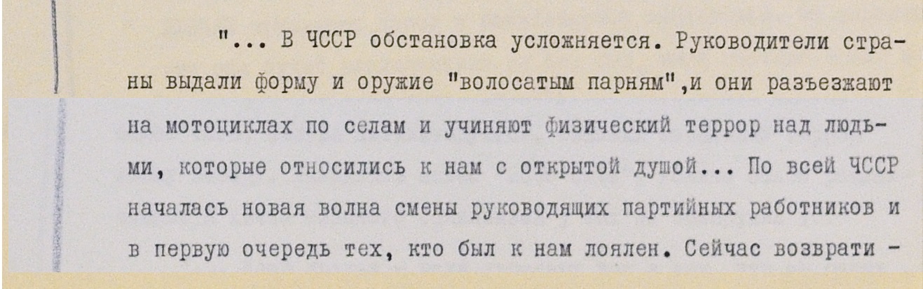 На фоне перемен в Чехословакии чекисты отмечают некоторый рост националистических настроений в Украине. В том числе – среди части резервистов. Львовянина Ивана Гладкого в мае призвали в армию. Он служил в части, большинство в которой составляли украинцы. Резервисты открыто говорили о нежелании “воевать за других” и требовали демобилизации. Некоторые из них еще и пели на территории части "националистические песни" – какие именно, в доносе не уточняется. В итоге часть резервистов-украинцев якобы демобилизовали, прислав вместо них кадровых военных.