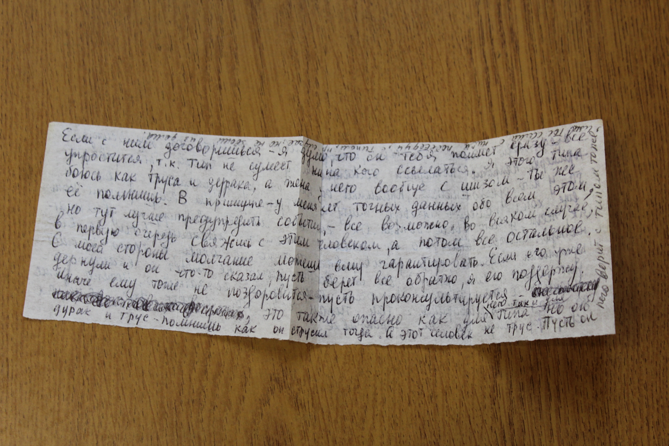 Некоторые из агентов, готовясь выйти на свободу, предлагали Каценбогену помощь — передать жене и другим людям записки от него. Тот соглашался. Это тоже были задания от чекистов, которые сразу же узнавали о содержании посланий. Один из тех скомканных клочков бумаги хранится в деле «Крота». В записке заключенный просит супругу срочно связаться с неким человеком. Он описан так, чтобы никто кроме жены не понял, о ком речь.