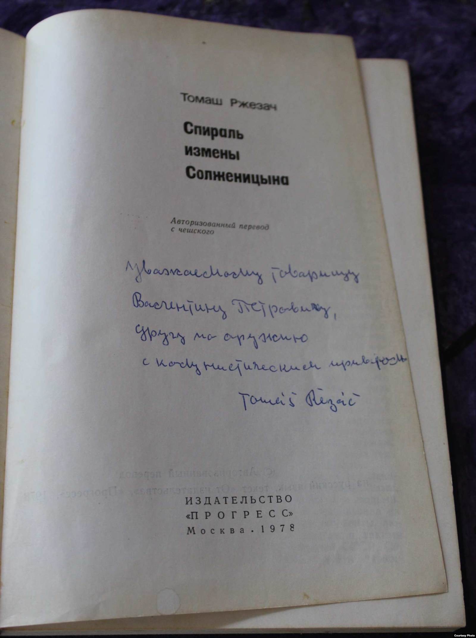 Каценбоген показывает экземпляр «Спирали измены...», презентованный и подписанный автором. Автограф, правда, адресован не ему, а общему знакомому Валентину Петровичу. Книга, подписанная для самого Рудольфа, наоборот, осталась у Валентина Петровича — так вышло случайно.