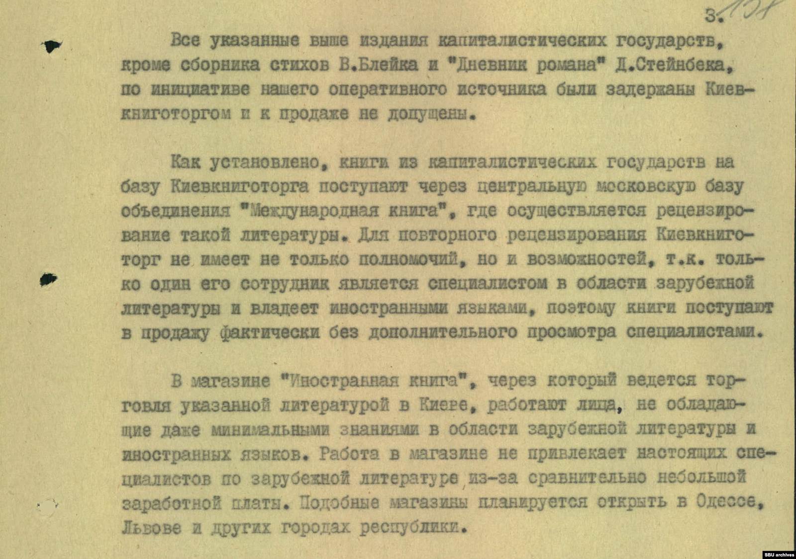 КГБшники уточняли, что западная литература поступала в Киев не напрямую из-за границы, а через Москву. На московской базе объединения «Международная книга» книги рецензировали и распределяли для поставок в разные регионы. Московские литературоведы, отвечавшие за содержание этих изданий, почему-то не замечали привезенную крамолу (хотя сколько изданий все же забраковали, мы не знаем).