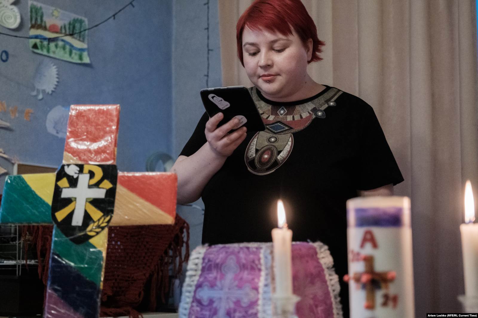 На столе перед Александром – ноутбук с фотографией Мартина Лютера Кинга и цитатой "I have a dream..." на заставке. Священник раздает прихожанам распечатки молитв. Портативная колонка, из которой доносятся гимны. Разноцветный крест, скатерть, чаша для богослужений.