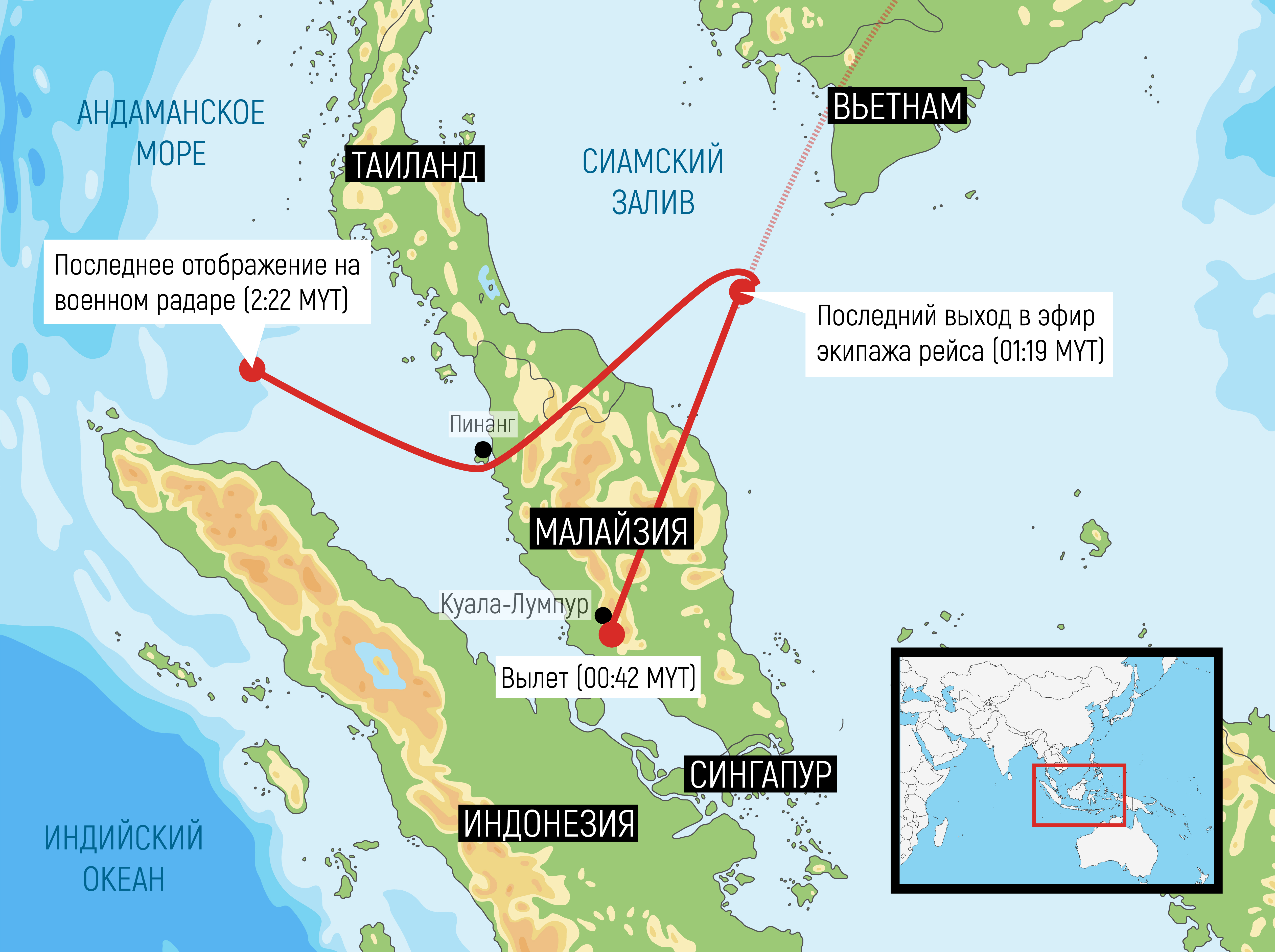 Вскоре после взлета авиалайнер штатно набрал высоту 35 000 футов (11 км) – что зачем-то два раза подряд подтвердил авиадиспетчерам – и направился на северо-восток, в полном соответствии с запланированным маршрутом: над Малайзией, через Сиамский залив к Вьетнаму.