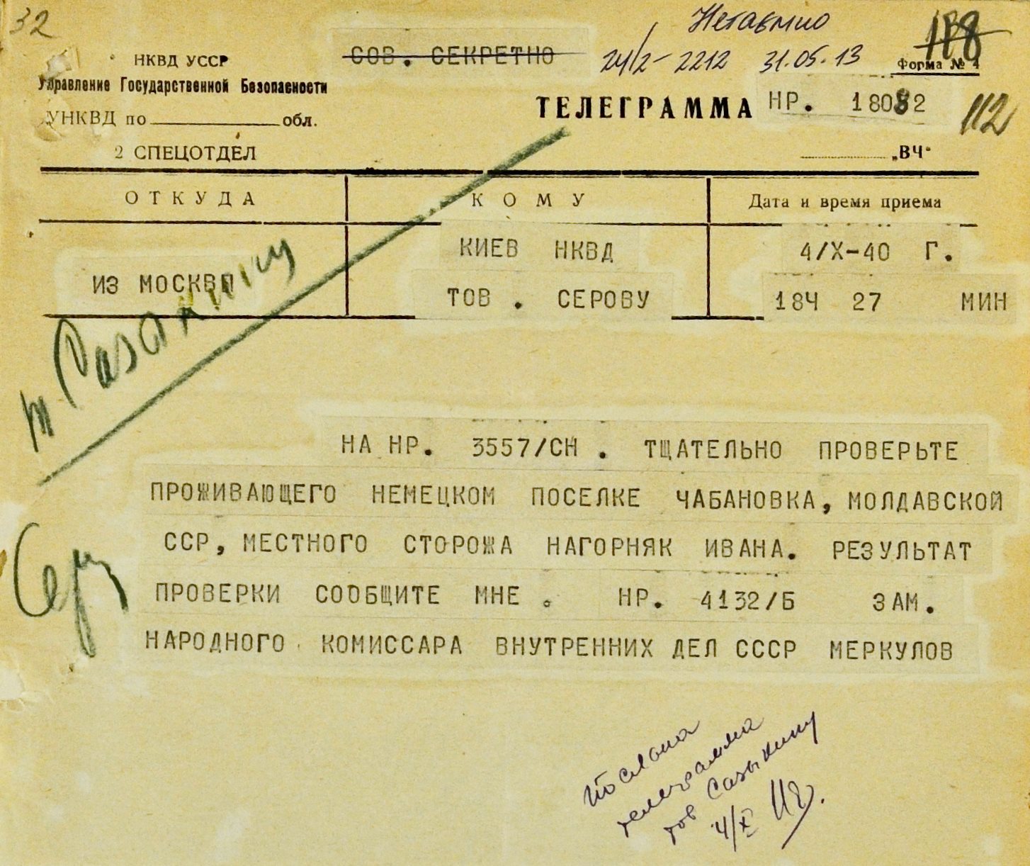 В начале октября 1940 года из Кишинева в Киев пришло сообщение о чрезвычайном происшествии в молдавском селе Чабановка*. Утверждалось, что местный сторож Иван Нагорняк «на регистрационном пункте забрал немецкий флаг, сжег, снял со стены портрет фюрера и изорвал».