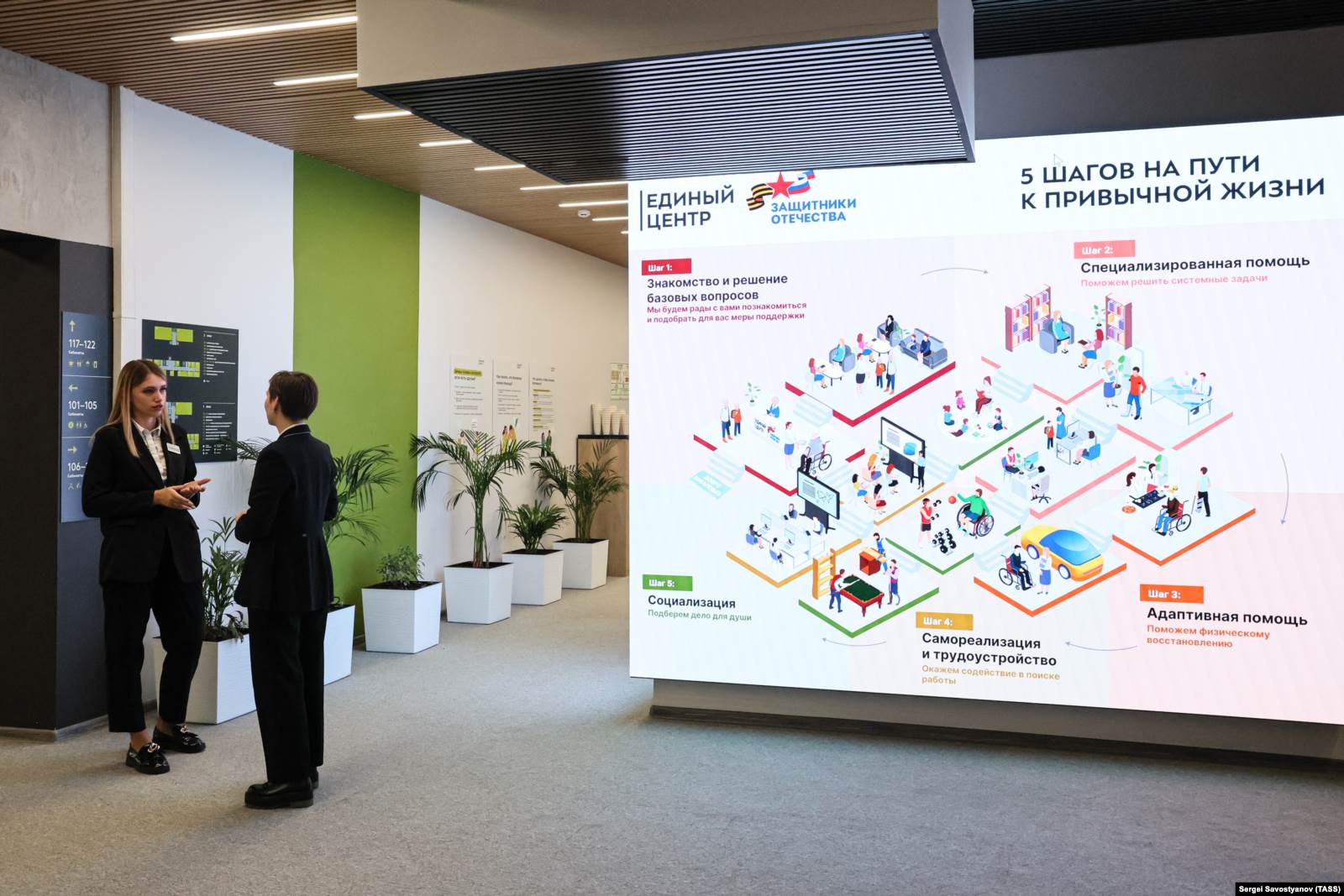 На фасаде здания, перестроенного из бывшего политехнического колледжа, корреспондент "Системы" не увидел никакой патриотической символики, никаких "Z" или "V". Центр работает с девяти утра до девяти вечера, выходной день – понедельник, чтобы люди могли прийти в свободное от работы время. Центр открыт для всех, как церковь, но сразу за дверью – два предельно вежливых, но очень строгих охранника с тем металлическим холодом в глазах, по которому россиянин безошибочно отличает сотрудника спецслужб: