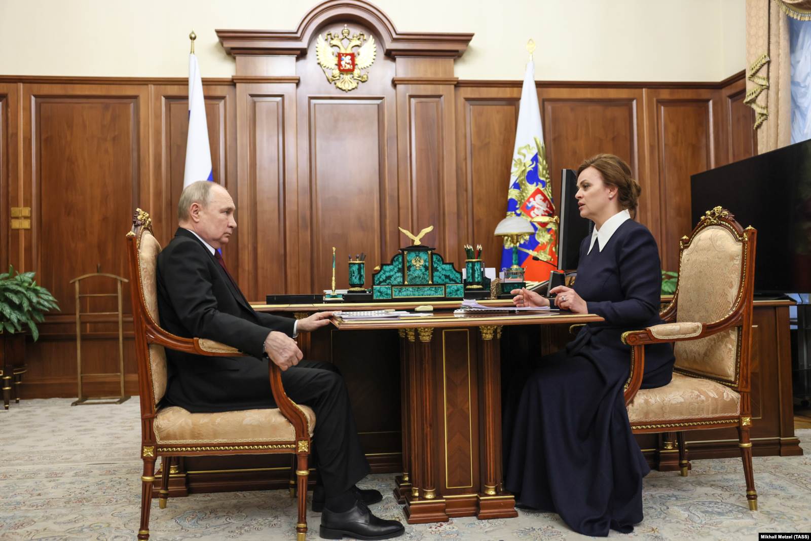 Владимир Путин и глава фонда "Защитники Отечества" Анна Цивилева на встрече в Кремле в апреле 2024 года