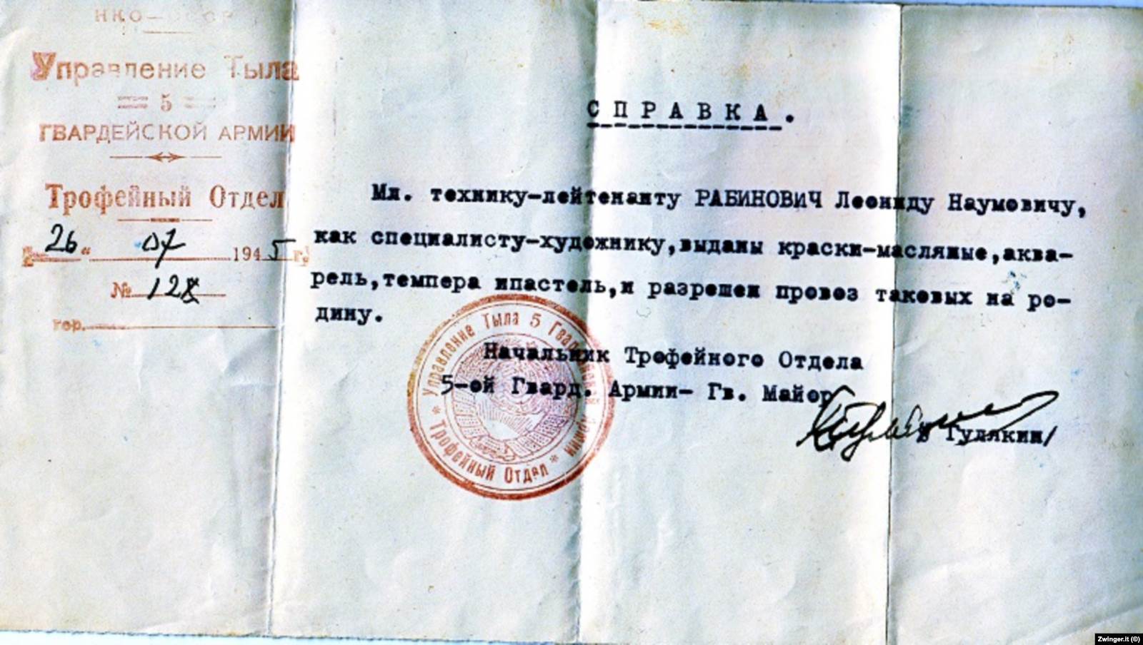 "Не буду приписывать себе какую-то особенную инициативу в розысках Дрезденской галереи, но внимание, которое я смог уделить этому делу в то горячее время, я уделил. Поинтересовался, занимаются ли розысками, кто занимается, и выяснил, что в трофейной бригаде 5-й гвардейской армии есть художник Рабинович, проявляющий большой энтузиазм в розысках картин; он натолкнулся на множество трудностей; необходимо было оказать ему помощь: дать для розысков специальную команду, а также выделить из органов разведки опытных людей, которые могли быть ему полезны".