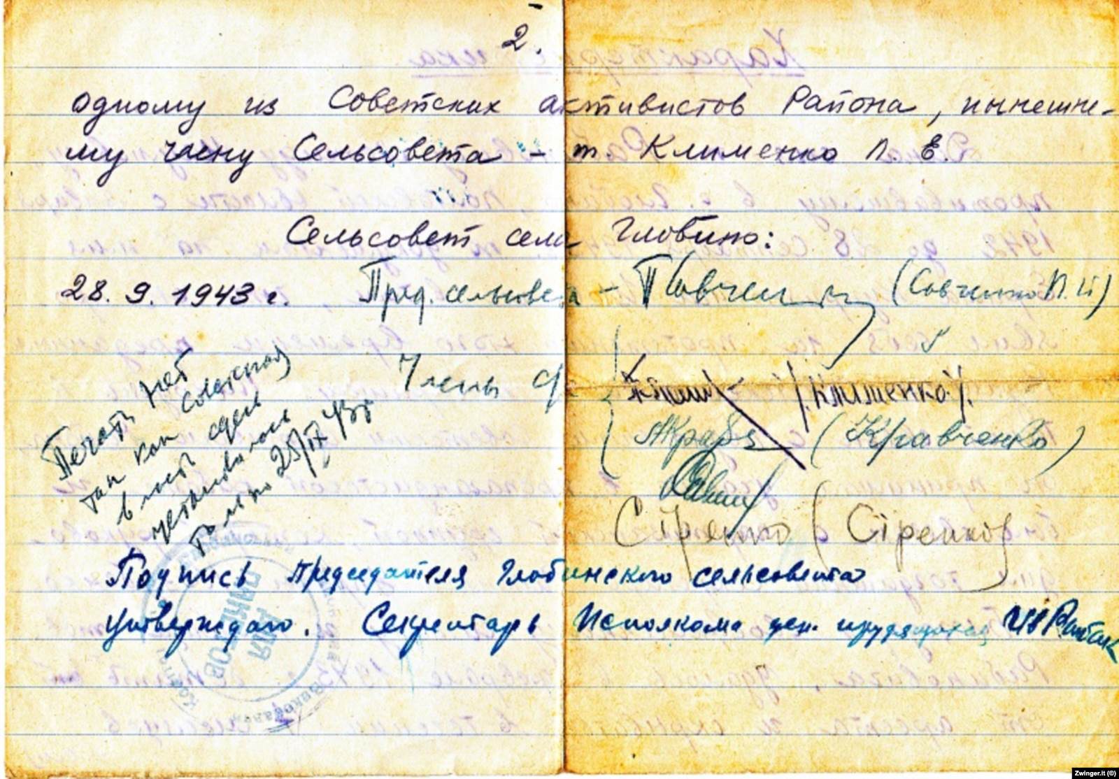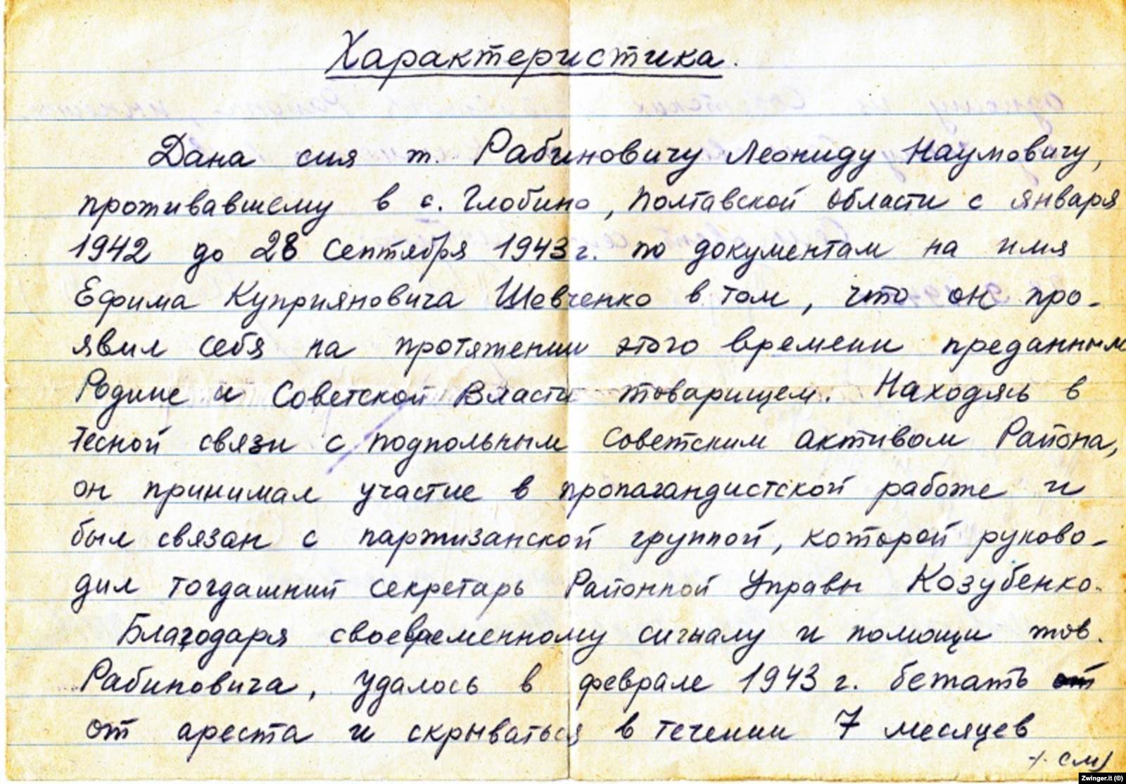 Когда линия фронта стала меняться и село Глобино, где он скрывался, снова заняла советская армия, Рабинович явился к своим. Пройти проверку СМЕРШ, избежать ареста и не оказаться в лагере ему помог удивительный документ – характеристика-справка от руководства партизанского отряда и сельсовета.