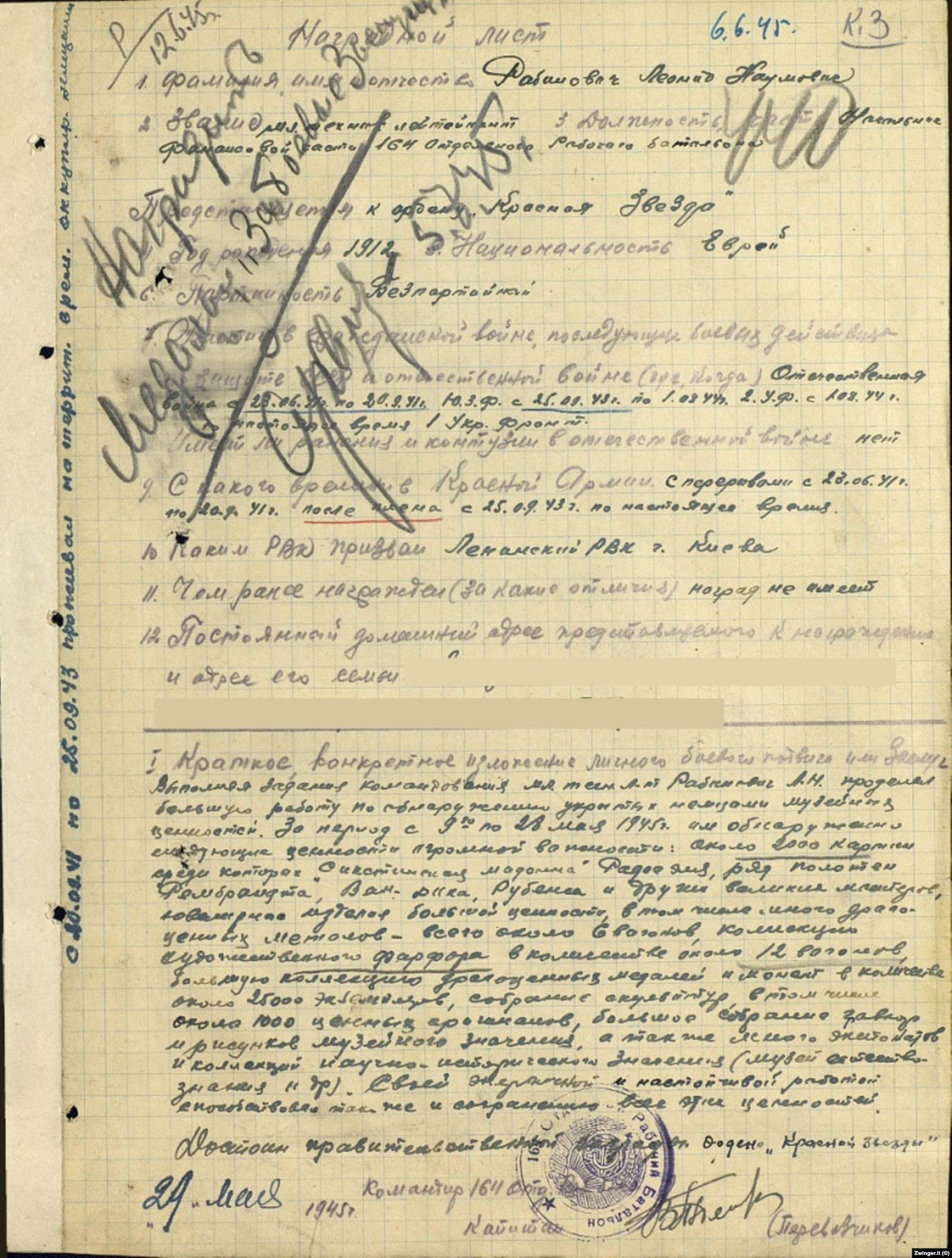 Но строчка "после плена", подчеркнутая в этом же документе красным карандашом, оставила Рабиновича без ордена. Его наградили медалью "За боевые заслуги". А еще выдали из трофейных запасов в Москве краски и пастельные мелки.