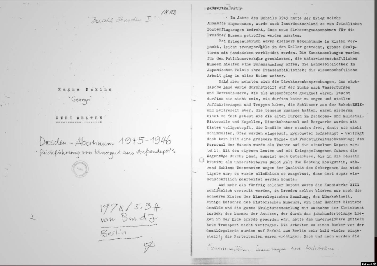 "Все произведения искусства останутся в Германии, мы хотим лишь удостовериться, что в хранилищах с ними ничего не случится", – пообещал ей молодой русский лейтенант, появившийся в Альбертинуме в начале мая. Его фамилия Рабинович, запомнила Энкинг: через несколько лет она опишет события в Дрездене 1945-1946 годов в автобиографических записках, где изобразит себя под псевдонимом "Георга".