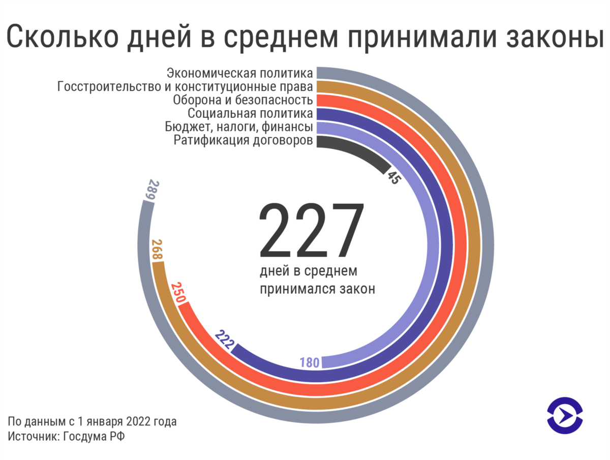 В среднем каждый закон принимался 227 дней, такое большое число получилось из-за законопроектов, которые откладывались годами: как минимум 117 документов рассматривали год или больше.